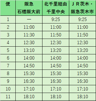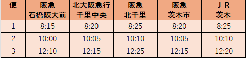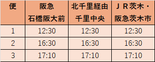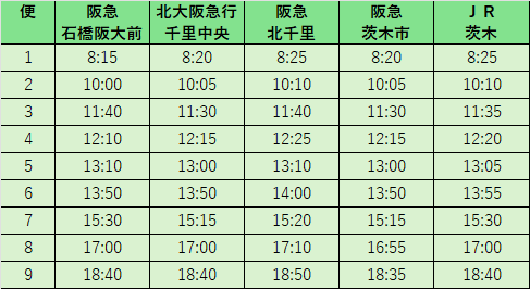 ■スクールバス利用(推奨) | 5つの最寄り駅(北大阪急行千里中央・阪急北千里、阪急茨木市・JR茨木、阪急石橋阪大前)から 発車するスクールバスを無料で利用できます。 乗り場への行き方は<大学HP>でご確認ください。 11月29日(土)は大学の土曜ダイヤで運行します。 11月30日(日)は学会特別ダイヤで運行します。 ◆11月29日 大学行 ◆11月29日 大学発 ![]() ![]() ◆11月30日 大学行 ◆11月30日 大学発 ![]() ![]() |
