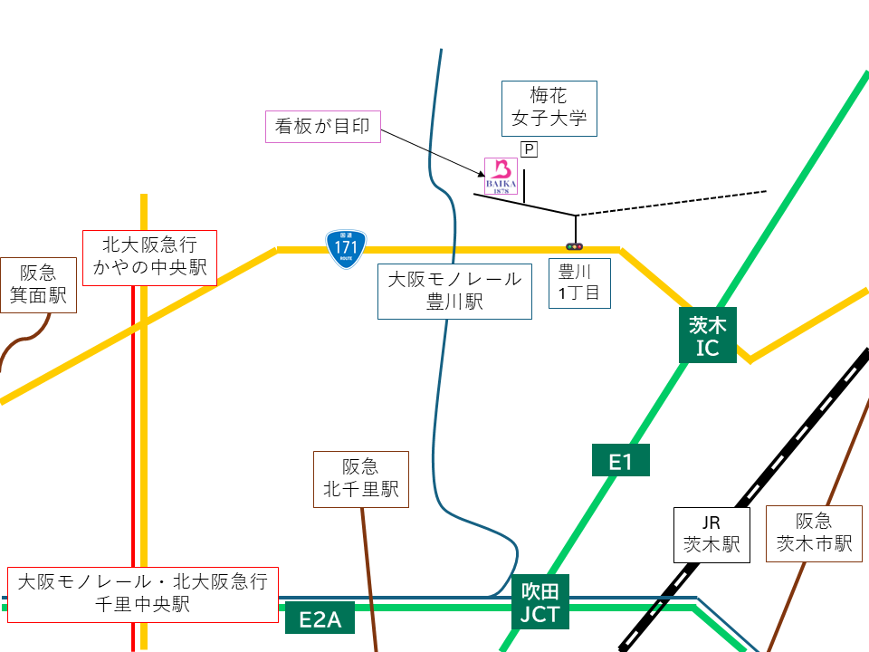 ■自家用車でのご来場 | ナビ等に「梅花女子大学」もしくは「茨木市宿久庄2‐19-5」を入れていただくと、 正門下の駐車場へのルートが表示されます。 守衛の指示で駐車し、受付をしてください ※駐車場は40台分しかありません。なるべくスクールバスのご利用や、乗り合わせ出のご来場にご協力ください。 |